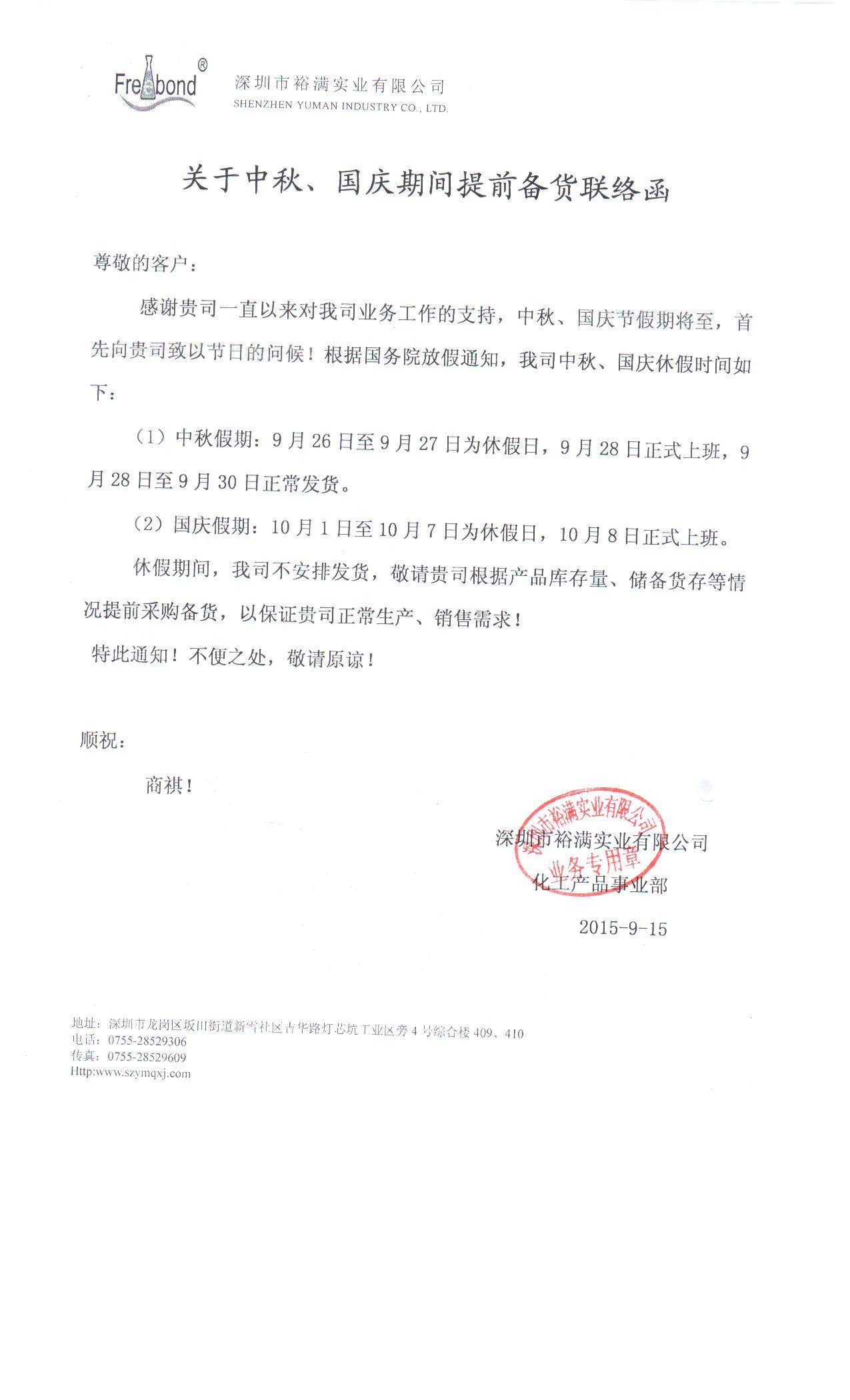 關于中秋、國慶期間提前備貨聯(lián)絡函