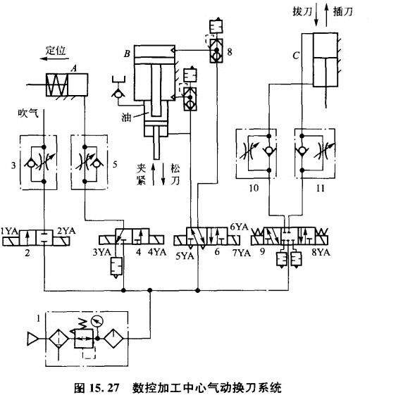 9、單向節(jié)流閥11進入缸C的上腔,缸C下腔排氣,活塞下移實現(xiàn)拔刀。自回轉刀庫交換刀具,同時lYA通電,壓縮空氣經(jīng)換向閥2、單向節(jié)流閥3向主軸錐孔吹氣。稍后lYA斷電、2YA通電,停止吹氣, 8YA斷電、7YA通電,壓縮空氣經(jīng)換向閥9、單向節(jié)流閥10進入缸C的下腔,活塞上移,實現(xiàn)插刀動作。6YA斷電、5YA通電,壓縮空氣經(jīng)閥6進入氣液增壓氣B的下腔,使活塞退回,主軸的機械機構使刀具夾緊。4YA斷電、3YA通電,缸A的活塞在彈簧力作用下復位,恢復到開始狀態(tài),換刀結束。