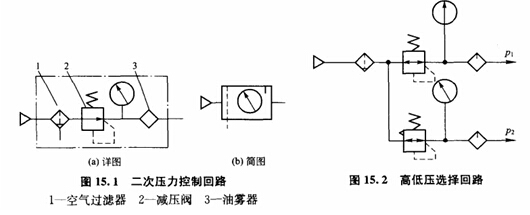 在實(shí)際應(yīng)用中,某些氣功控制系統(tǒng)需要有不同壓力的選擇。例如,在加工塑料門(mén)窗的三點(diǎn)焊機(jī)的氣動(dòng)控制系統(tǒng)中,用于控制工作臺(tái)移動(dòng)的回路的工作壓力為0.25MPa~0.3MPa,而用于控制其他執(zhí)行元件的回路的工作壓力為0.5MPa~0.6MPa。這種情況可采用如圖15.2所示的高、低壓選擇回路。該回路只要分別調(diào)節(jié)兩個(gè)減壓閥,就能得到所需要的高壓和低壓輸出。