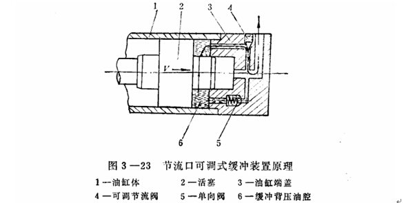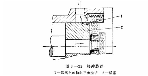 圖3-22是活塞頭部帶有軸向三角節(jié)流溝梢的緩沖裝置。當(dāng)活塞運動到接近終點時將回油路封閉,油缸中剩下的油液只能通過三角狗槽流出,形成液壓阻力;钊酵耙,阻力越大,直至移動部件停止運動。也有在油缸端部加可調(diào)節(jié)流間,使油缸中被封閉的油液經(jīng)可調(diào)節(jié)流閥口流出,這樣便可按負(fù)載慣性力大小適當(dāng)調(diào)節(jié)緩沖背壓,其工作原理示于圖3-23。