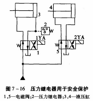 (1)用于安全保護(hù)。如圖7 -16所示,將壓力繼電器2設(shè)置在夾緊液壓缸的一端,液壓泵啟動(dòng)后,首先將工件夾緊,此時(shí)夾緊液壓缸3的右腔壓力升高,當(dāng)升高到壓力繼電器的調(diào)定值時(shí),壓力繼電器2動(dòng)作,發(fā)出電信號(hào)使2YA通電,于是切削液壓缸4進(jìn)刀切削。在加工期間,壓力繼電器2微動(dòng)開(kāi)關(guān)的常開(kāi)觸頭始終閉合。若工件沒(méi)有夾緊,繼電器2斷開(kāi),于是2YA斷電,切削缸4立即停止進(jìn)刀,從而避免工件未夾緊被切削而出事故。
