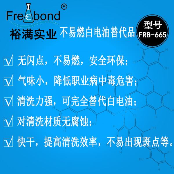白電油替代品|環(huán)保白電油|替代白電油清洗劑|裕滿清洗劑FRB-665是一種用于替代白電油等正己烷類溶劑的環(huán)保清洗劑;本品不僅具有正己烷類溶劑良好的清洗力,還可降低職工正己烷等化學(xué)品急性和慢性中毒危害。