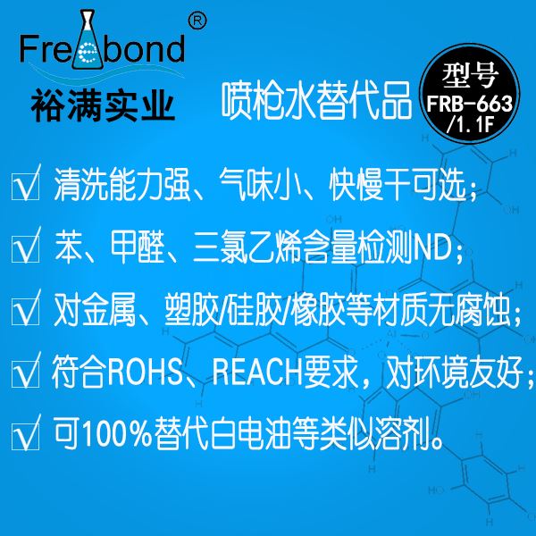 噴槍水替代品|環(huán)保噴槍水|替代噴槍水清洗劑FRB-663/FRB-1.1F是裕滿實業(yè)專業(yè)研發(fā)的一種用于替代噴槍水等相似溶劑的環(huán)保清洗劑。