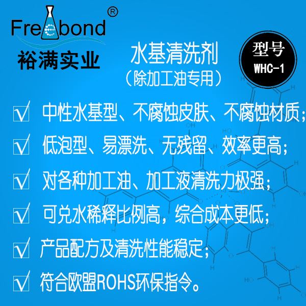 中性水基清洗劑|中性水性清洗劑|中性脫脂除油劑|裕滿清洗劑WHC-1是一款以表面活性劑為主要成份的水基清洗劑;本品能夠徹底的清除工件表面的各種加工油、加工液等臟污,具有清洗力強(qiáng)、性能穩(wěn)定、低泡型易漂洗、綜合成本低、不腐蝕材質(zhì)等優(yōu)點(diǎn)。