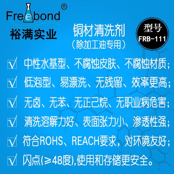 碳?xì)溷~材清洗劑|碳?xì)溷~材脫脂劑|碳?xì)溷~材除油劑|裕滿清洗劑 FRB-111是用于清洗金屬生產(chǎn)加工制造過程中表面殘留加工油、塵埃等各類污物的無毒環(huán)保清洗劑,本品具有清洗力強(qiáng)、清洗性能穩(wěn)定、對材質(zhì)無腐蝕、環(huán)保安全、無毒無害、綜合成本低等優(yōu)點。