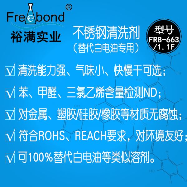 不銹鋼表面擦拭劑|不銹鋼表面擦拭清洗劑|裕滿清洗劑FRB-663/FRB-1.1F是一種用于替代白電油等正己烷類溶劑的環(huán)保清洗劑;本品不僅具有正己烷類溶劑良好的清洗力,還可降低職工正己烷等化學品急性和慢性中毒危害。