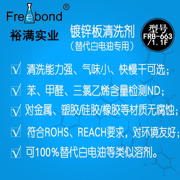 鍍鋅板表面擦拭劑|鍍鋅板表面擦拭清洗劑|裕滿清洗劑FRB-663/FRB-1.1F是一種用于替代白電油等正己烷類溶劑的環(huán)保清洗劑;本品不僅具有正己烷類溶劑良好的清洗力,還可降低職工正己烷等化學(xué)品急性和慢性中毒危害。