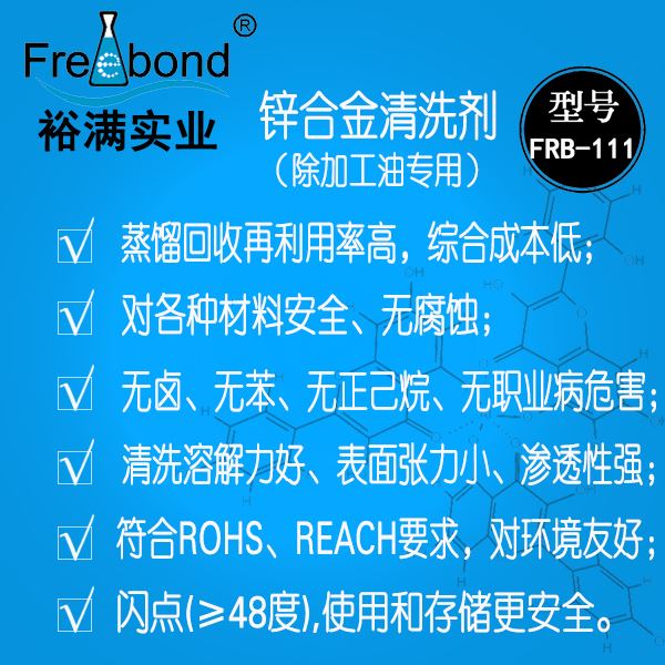 碳氫鋅合金清洗劑|碳氫鋅合金脫脂劑|碳氫鋅合金除油劑|裕滿清洗劑 FRB-111是用于清洗金屬生產(chǎn)加工制造過程中表面殘留加工油、加工液、水份、塵埃等各類污物的無毒環(huán)保清洗劑,本品具有清洗力強、清洗性能穩(wěn)定、對材質(zhì)無腐蝕、環(huán)保安全、無毒無害、綜合成本低等優(yōu)點。