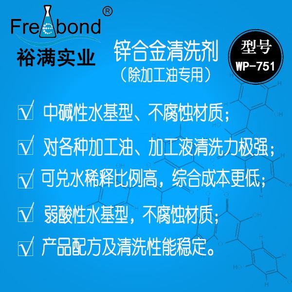 堿性鋅合金清洗劑|堿性鋅合金脫脂除油劑|裕滿清洗劑WP-751是一款以表面活性劑為主要成份的水基清洗劑;本品能夠徹底的清除工件表面的各種加工油、加工液等臟污,具有清洗力強、性能穩(wěn)定、綜合成本低、不腐蝕材質(zhì)等優(yōu)點。