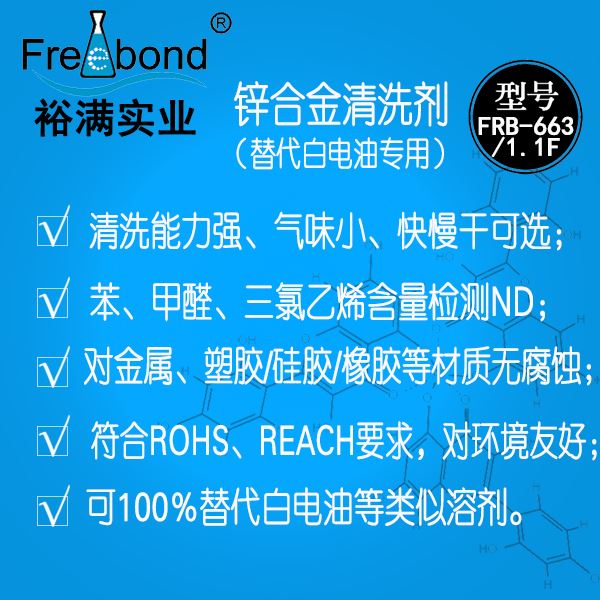 鋅合金表面擦拭劑|鋅合金表面擦拭清洗劑|裕滿清洗劑FRB-663/FRB-1.1F是一種用于替代白電油等正己烷類(lèi)溶劑的環(huán)保清洗劑;本品不僅具有正己烷類(lèi)溶劑良好的清洗力,還可降低職工正己烷等化學(xué)品急性和慢性中毒危害。