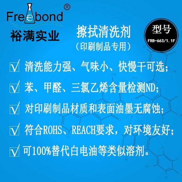 裕滿 印刷表面擦拭劑|印刷表面擦拭清洗劑 FRB-663/FRB-1.1F 是一種用于替代白電油等類似溶劑的環(huán)保清洗劑;本品不僅具有白電油等類似溶劑良好的清洗力,還可降低職工正己烷等化學(xué)品急性和慢性中毒危害。