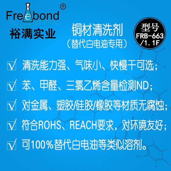 銅材表面擦拭劑|銅材表面擦拭清洗劑|裕滿清洗劑FRB-663/FRB-1.1F是一種用于替代白電油等正己烷類溶劑的環(huán)保清洗劑;本品不僅具有正己烷類溶劑良好的清洗力,還可降低職工正己烷等化學(xué)品急性和慢性中毒危害。