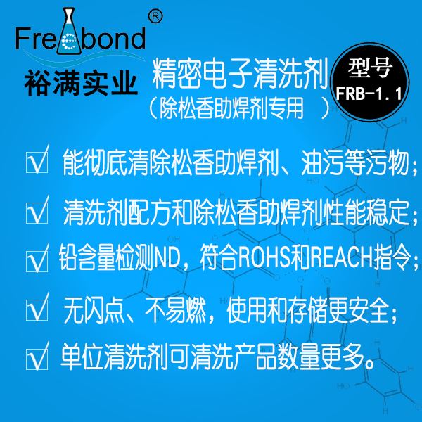 無鉛環(huán)保電子清洗劑|精密電子清洗劑|裕滿清洗劑FRB-1.1是一款替代三氯乙烯,三氯乙烷用于清洗松香、助焊劑、油污等各類污物的清洗劑;本品清洗力強(qiáng)、除松香性能穩(wěn)定、環(huán)保無鉛、不易燃、無腐蝕、綜合成本低等優(yōu)點(diǎn)。