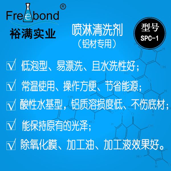 鋁材噴淋清洗劑|鋁材噴淋脫脂劑|鋁材噴淋除油劑|裕滿清洗劑 SPC-1是一款由多種表面活性物組成,用于清洗鋁型材擠壓料表面油污、油脂及自然氧化膜的鋁材清洗劑;本品適用于各種鋁材件、鋁型材立式氧化及噴涂前處理除氧化膜、脫脂除油使用。